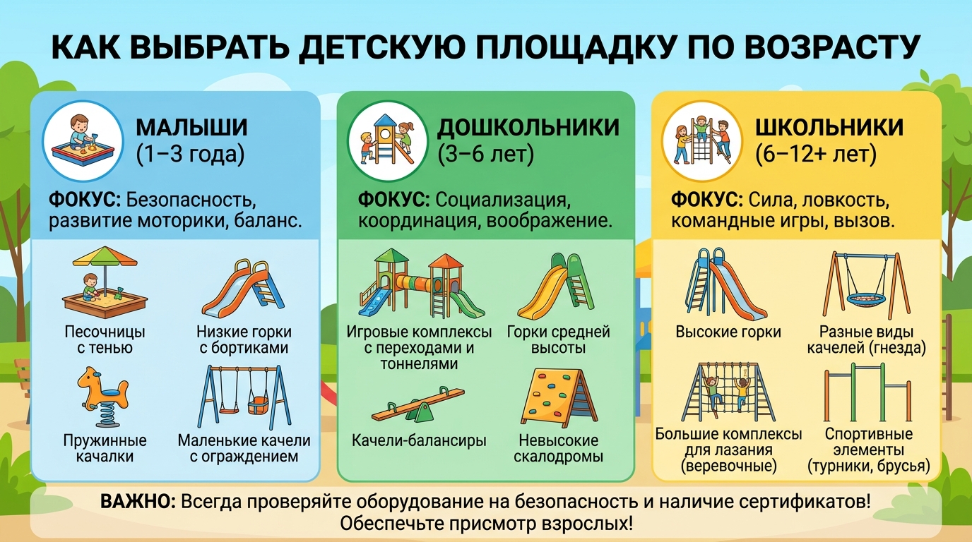 Игровые комплексы — центральный элемент большинства детских площадок, от которого зависит интерес детей и безопасность пространства. Подбор оборудования по возрасту — ключевая задача на этапе проектирования, потому что разные группы детей по‑разному используют одни и те же элементы. Универсальный комплекс «для всех» часто приводит к тому, что малышам страшно, а старшим скучно.