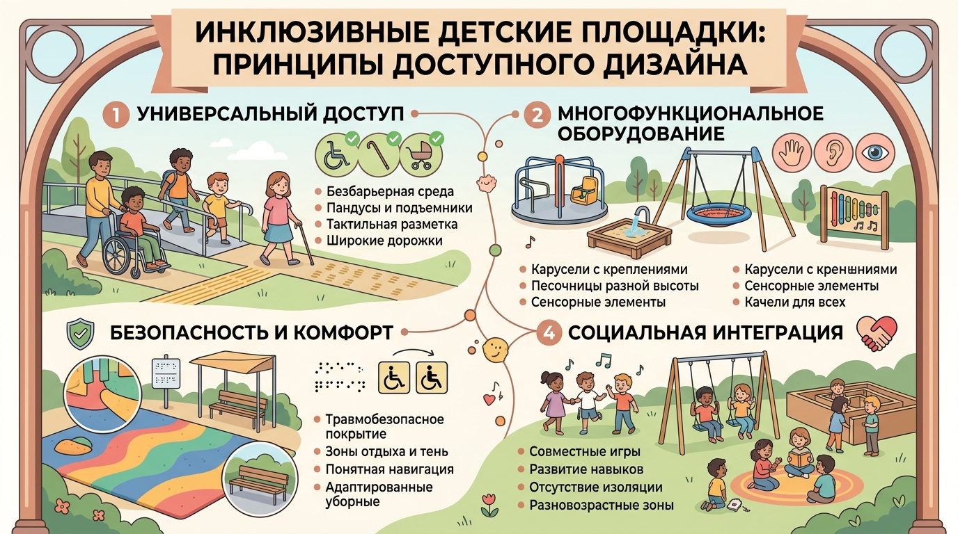 Основной принцип инклюзивного дизайна — доступность всех главных игровых зон для детей на коляске, с ограничениями по зрению, слуху или моторике. Для этого используют пандусы, расширенные проходы, низкие бордюры или их отсутствие, а также покрытие, по которому удобно передвигаться коляскам. Важно, чтобы ребёнок мог самостоятельно подъехать к игровому элементу и воспользоваться им без опасности.