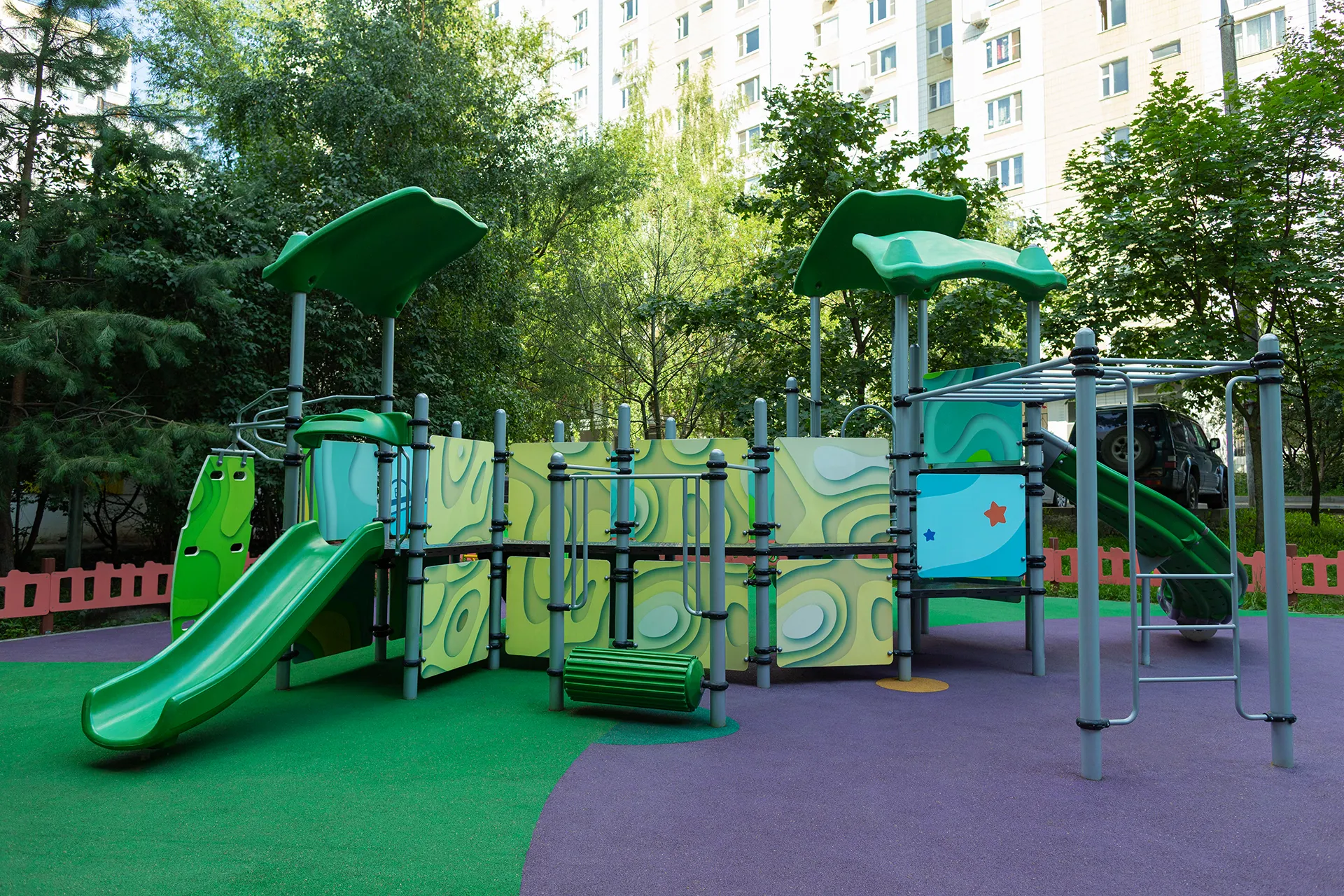 - Пластиковые элементы открытых спусков, барабан и крыша “Козырек” (3 шт.) изготовлены из линейного полиэтилена низкого давления методом ротоформования. Элементы наборного пластикового спуска должны быть скреплены между собой алюминиевыми соединительными вставками и закреплены болтами. Составной спуск оборудован перекладиной, побуждающей ребенка садится на спуске для обеспечения безопасности. Наборный спуск фиксируется в середине и на уровне земли с помощью закладной под трубу методом бетонирования. У начала открытого прямого спуска установлена перекладина, за которую ребенок может держаться, когда садится на спуск. Перекладина закрыта декоративным пластиковым козырьком для обеспечения безопасности. Спуск фиксируется на уровне земли с помощью закладной под трубу методом бетонирования.