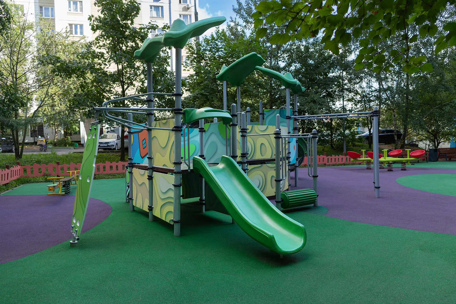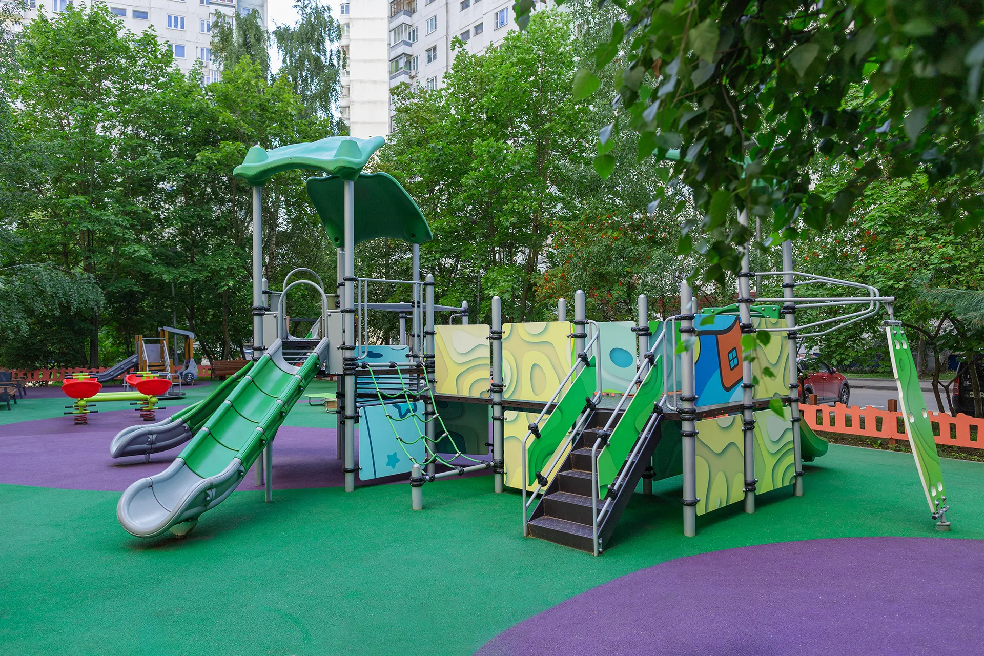 - Все металлические конструкции городка подвергаются обезжириванию, промывке, барботажу, травлению, а затем защитному оцинкованию или нанесению цинкосодержащего грунта с последующей окраской в автоматической линии. Окраска – полиэфирная порошковая с высокотемпературной сушкой. Порошковая краска имеет высокую стойкость к климатическим условиям и эстетичный внешний вид. Изделия из металла имеют плавные радиусы закругления и тщательную обработку швов. Сварные швы гладкие и исключают возможность травмирования пользователей при контакте.