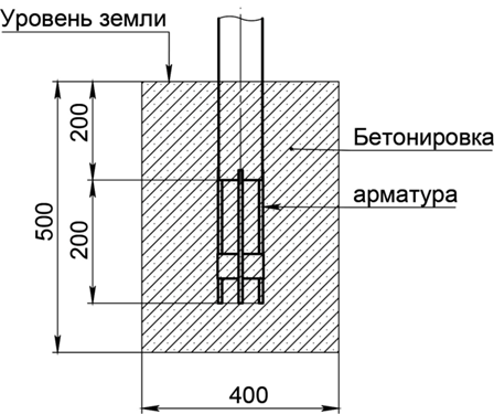 - Стойки 1400 мм (2 шт.), 1600 мм (2 шт.), 2400 мм (2 шт.) выполнены из стальной трубы диаметром не менее 89 мм, с толщиной стенки не менее 2 мм. Сверху стойки закрыты круглыми пластиковыми заглушками для труб. Конструкция устанавливаются с помощью специальных закладных под трубу в количестве 6 шт. (из арматуры длиной не менее 200 мм, диаметром не менее 8 мм) методом бетонирования.