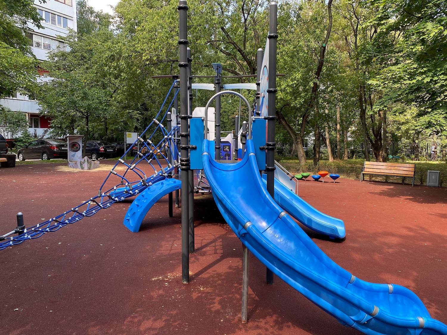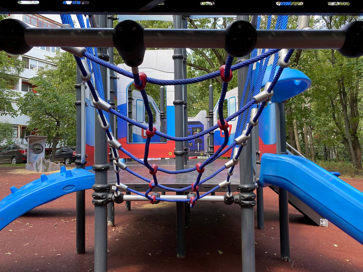 - Канатный переход (ногоход) 760х1500 мм с канатными креплениями перил (14 шт. по 850 мм), канатный лаз 1540 мм с боковыми сетками изготавливаются из комбинированного шестипрядного каната диаметром не менее 16 мм, который состоит из полипропиленовых прядей, шести оцинкованных жил и усиленного центрального полипропиленового сердечника для увеличения прочности и гибкости, что позволяет использовать его для конструкций сложных форм. Материал каната устойчив к воздействию УФ-излучения, не выгорает, хорошо сопротивляется механическим воздействиям. Крепление сетки лазов к закладной скобе/перекладине из металлической трубы диаметром не менее 42,3 мм и толщиной не менее 2,8 мм выполняется при помощи пластиковых хомутов из стеклонаполненного полиамида, фиксирующихся болтовыми соединениями, скрытыми в конструкции хомута. На уровне земли крепление скобы осуществляется с помощью закладных из арматуры длиной не менее 300 мм, диаметром не менее 8 мм методом бетонирования.