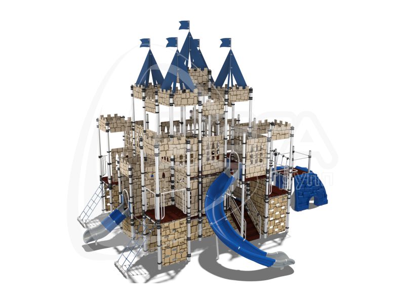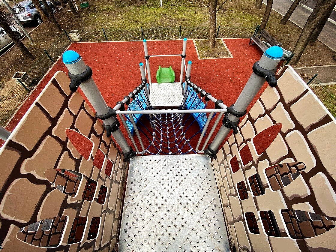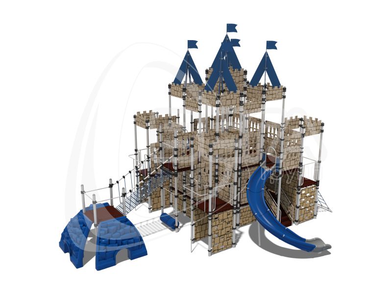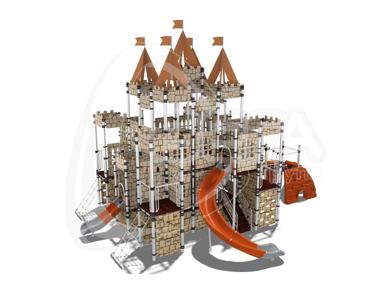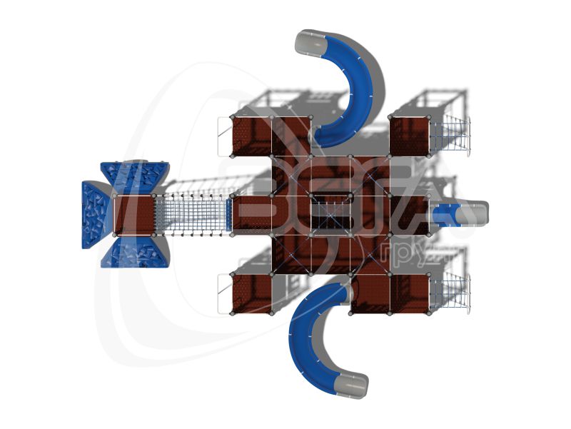 Городок состоит из игровых разноуровневых площадок. Комплекс оснащен двумя прямыми лестницами 900 мм с перилами, открытым прямым и двумя наборными пластиковыми спусками. Оборудован панелями “Руколаз” (4 шт.), тремя лазами ”Бастилия”, беговым барабаном, пожарными спусками, канатным лазом 1200 мм, лазом на высоту 1540 мм (2 шт.), канатным мостиком 2080 мм, перекладинами и перемычками.