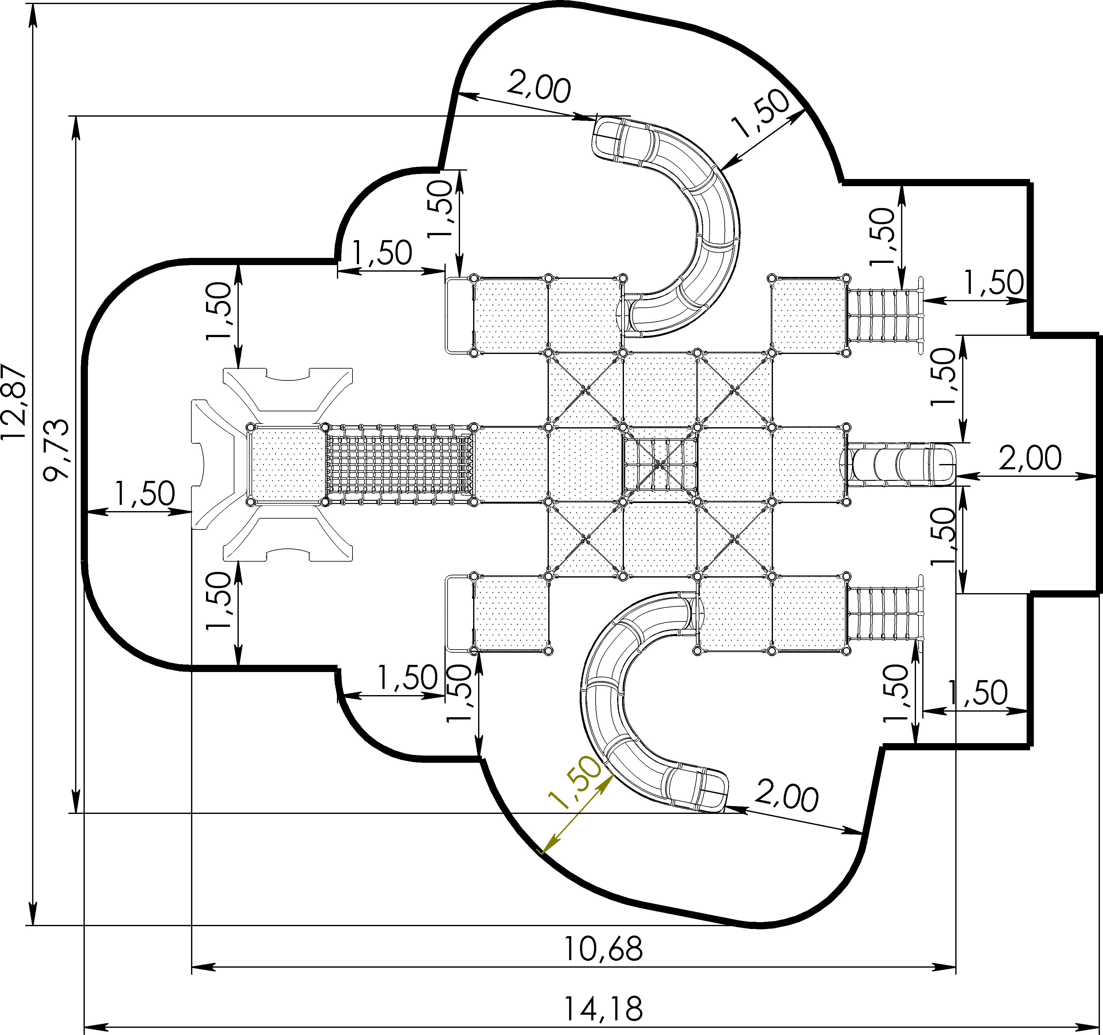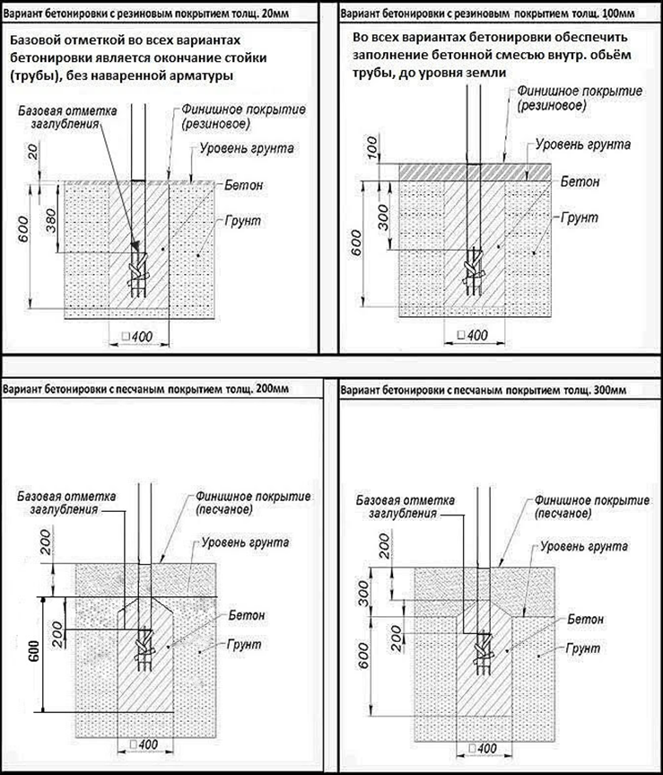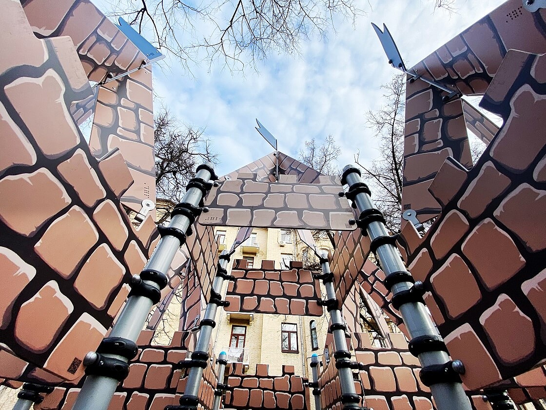 - Каркас городка выполнен из опорных стоек в количестве 38 шт. Опорная стойка представляет собой цельнометаллическую конструкцию из стальной трубы диаметром не менее 89 мм, с толщиной стенки не менее 2 мм, длиной 2600-6000 мм. Опорные стойки устанавливаются с помощью специальных закладных под трубу (из арматуры длиной не менее 200 мм, диаметром не менее 8 мм) методом бетонирования.