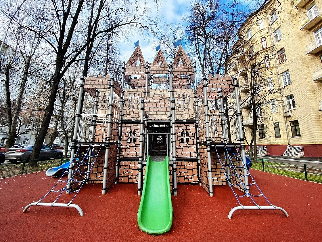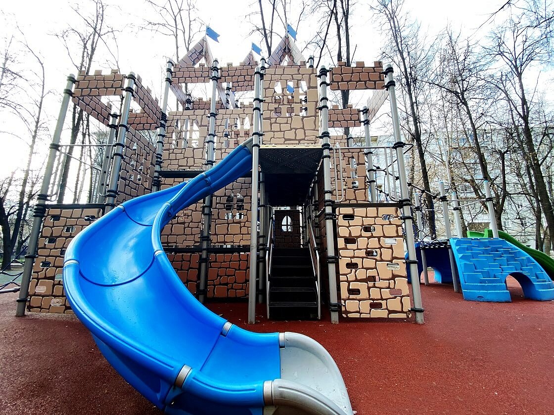 - Пластиковые элементы открытых спусков, барабан, лаз “Бастилия” (3 шт.) изготовлены из линейного полиэтилена низкого давления методом ротоформования. Элементы наборного пластикового спуска должны быть скреплены между собой алюминиевыми соединительными вставками и закреплены болтами. Составной спуск также оборудован перекладиной, побуждающей ребенка садится на спуске для обеспечения безопасности. Спуск фиксируется в середине и на уровне земли с помощью закладной под трубу методом бетонирования.