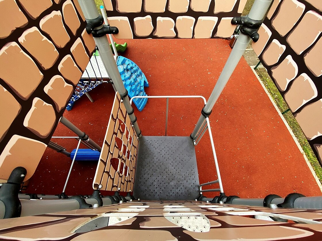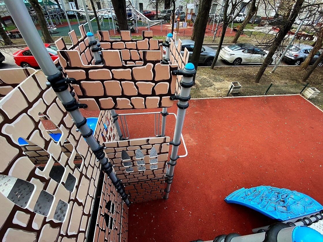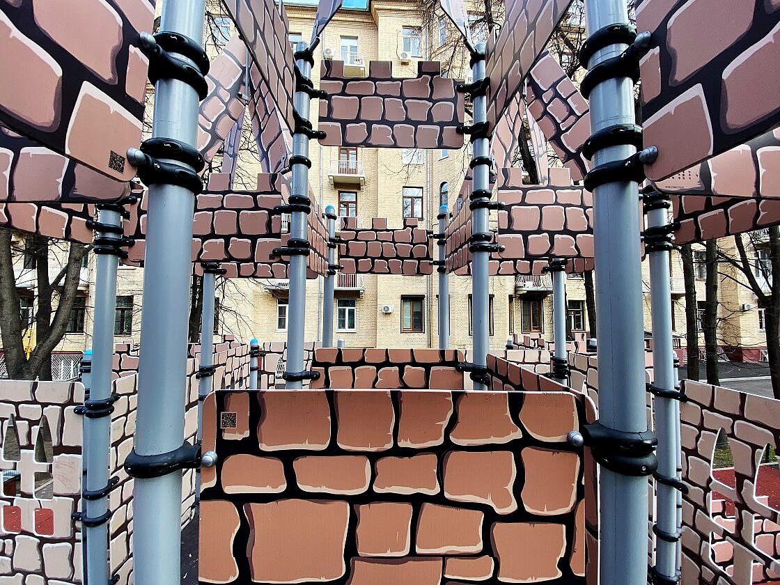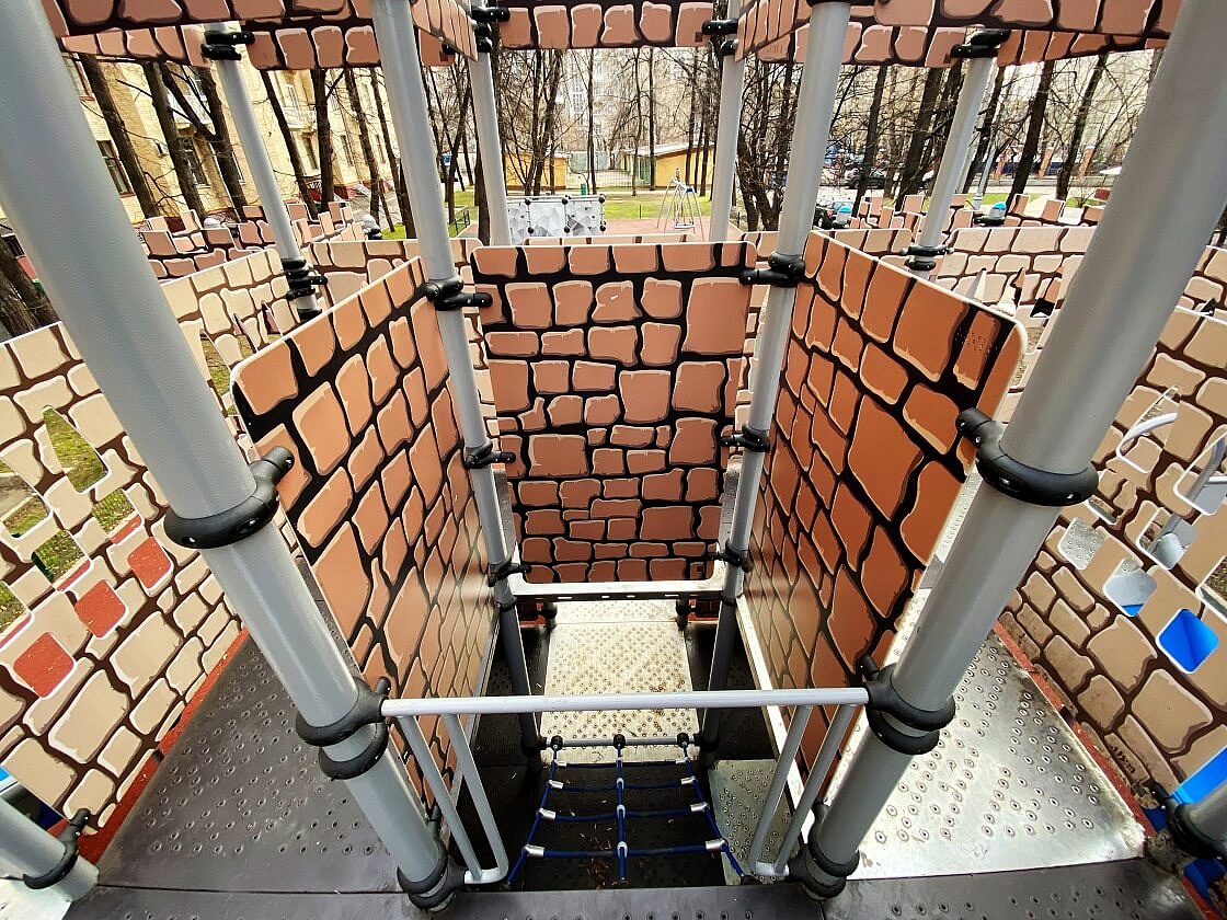 - Панель боковая (19 шт.), вставка в перила лестничные (4 шт.), панель два окна (11 шт.), панель зубья (41 шт.), крыша (20 шт.), панель три окна (21 шт.), флажок (5 шт.), панель высокая (8 шт.), панель “Руколаз” (4 шт.), фланец барабана, пластина крепления открытого спуска (6 шт.), панель боковая открытого спуска (6 шт.) и декоративные элементы изготовлены из влагостойкой фанеры FOF толщиной не менее 12 мм. Кромки фанеры закруглены и шлифованы. Панели крепятся при помощи держателей для крепления панели фанерной (526 шт.).