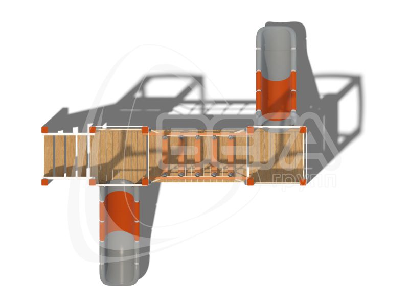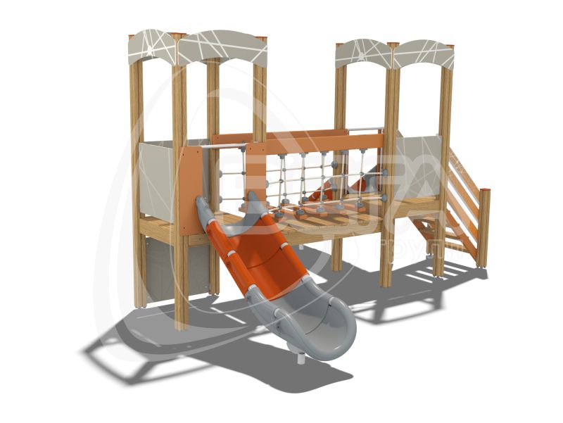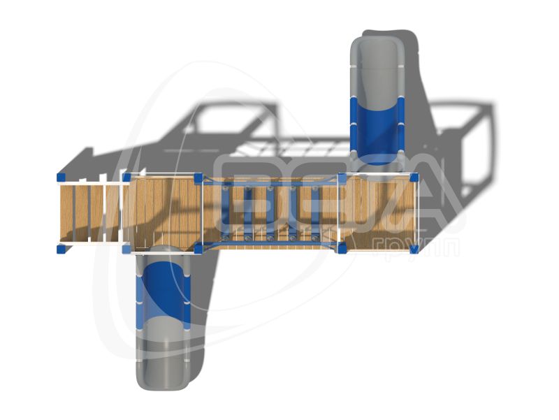- Канатный подвесной мостик выполнен из канатных сеток (2 шт.), досок-перил 40х140х1690 мм (2 шт.) и ступенек 40х90х700 мм (5 шт.). Страховочная часть мостика выполнена из опорных досок основания (2 шт.) размером 40х140х1690 мм и досок настила 40х90х800 мм (13 шт.). Канат крепится к доскам с помощью пластин для крепления. Канатный мостик изготавливается из комбинированного шестипрядного каната диаметром не менее 16 мм, который состоит из полипропиленовых прядей, шести оцинкованных жил и усиленного центрального полипропиленового сердечника для увеличения прочности и гибкости, что позволяет использовать его для конструкций сложных форм. Материал каната устойчив к воздействию УФ-излучения, не выгорает, хорошо сопротивляется механическим воздействиям. Все соединительные элементы, используемые для плетения сеток и лазов, изготавливаются из алюминиевого сплава на автоматизированной линии.