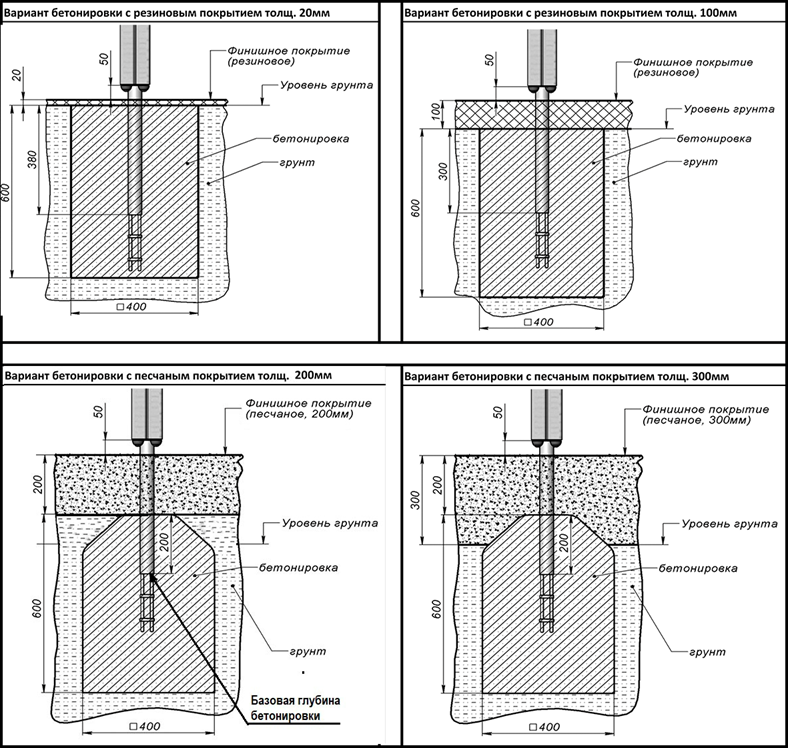 Установка оборудования проводится на ровной площадке, свободной от насаждений (см. рекомендации Министерства Регионального Развития РФ от 27 декабря 2011 г. № 613 "Об утверждении Методических рекомендаций по разработке норм и правил по благоустройству территорий муниципальных образований"), в соответствии с требованиями завода-изготовителя. При монтаже и бетонировке стоек из деревянного бруса расстояние от финишного покрытия до нижней точки бруса при вертикальном расположении стойки должно быть не более 50 мм, а при наклонном расположении стоек - не более 70 мм. При нарушении требований к монтажу и установке изделий гарантийные обязательства снимаются с завода-изготовителя.