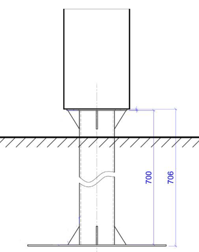 - Опорные закладные под стойки представляют собой цельнометаллическую конструкцию из стальных труб диаметром не менее 42,3 мм, с толщиной стенки не менее 3,2 мм, из арматуры длиной не менее 200 мм, диаметром не менее 8 мм и площадки из стального листа толщиной не менее 5 мм. Монтаж конструкции выполняется методом бетонирования.