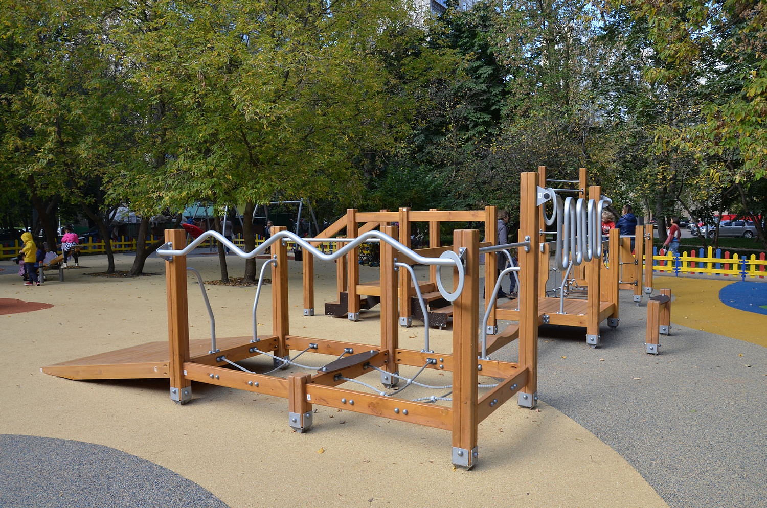 Спортивный комплекс оборудован деревянными площадками, лестницами, подвесным канатным мостиком на 2600 мм, брусом “Волна” с перемычкой “Змейка”, пандусом, двумя канатными сетками с перемычкой “Волна”, перекладинами и перемычками. Оснащен лавочками, сидушками, элементом “Твист”. Выполнен с использованием деревянного каркаса (столбы) на металлических опорных закладных.