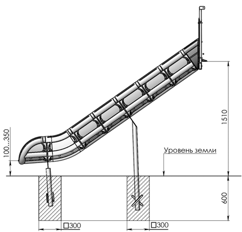 - Пластиковые элементы открытых спусков изготовлены из линейного полиэтилена низкого давления методом ротоформования. Элементы наборного прямого пластикового спуска должны быть скреплены между собой алюминиевыми соединительными вставками и закреплены болтами. Составной спуск оборудован поручнем для входа на спуск, побуждающим ребенка садится на спуске для обеспечения безопасности. Спуск фиксируется в середине и на уровне земли с помощью закладной под трубу методом бетонирования.