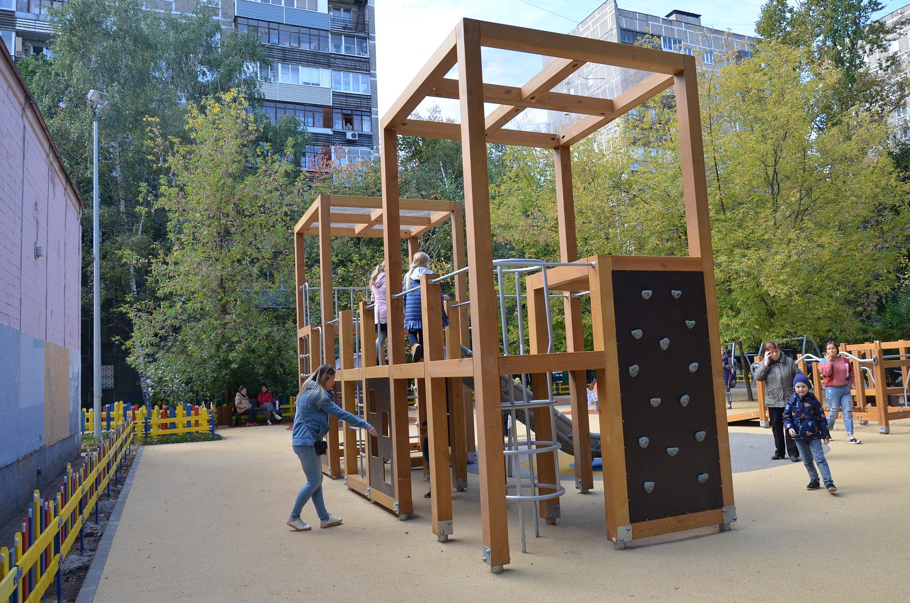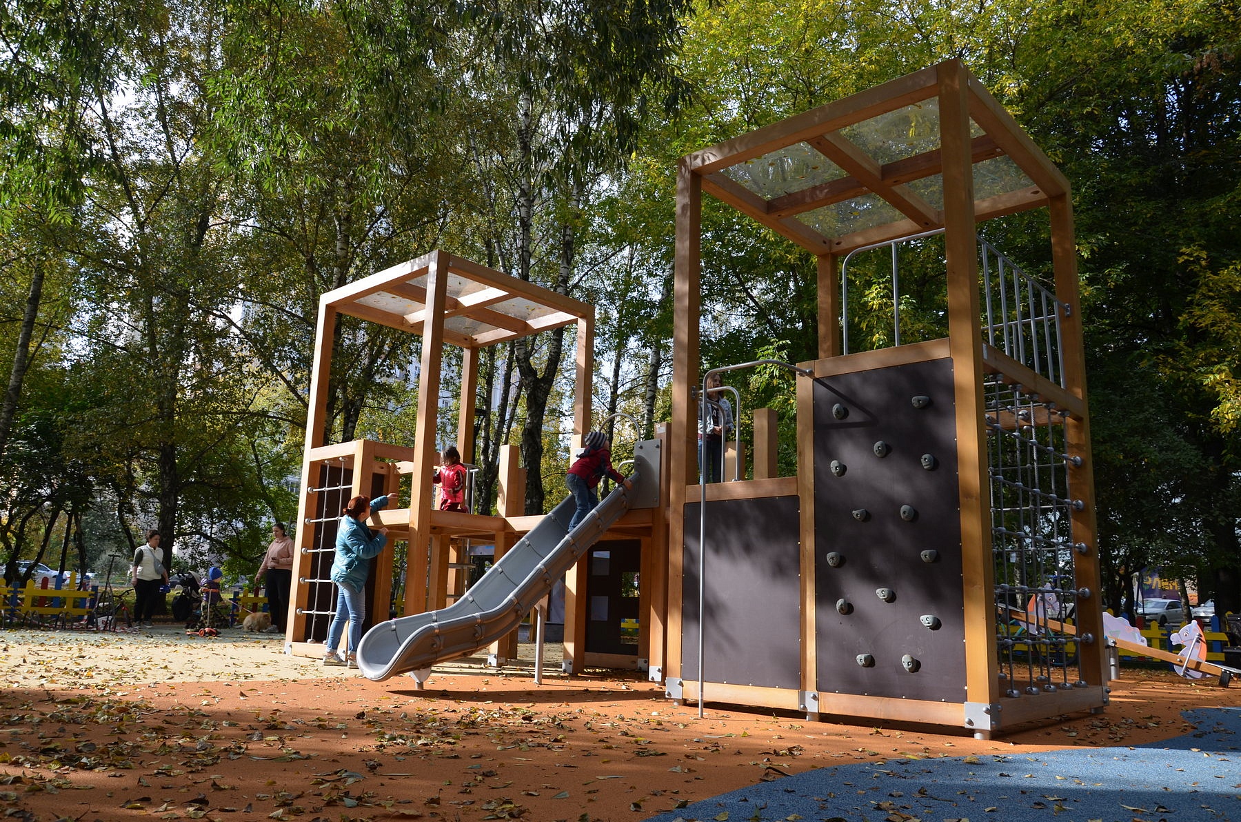 Игровой комплекс оборудован деревянными площадками, одним открытым наборным пластиковым спуском, пожарным спуском, двумя металлическими лазами “Цилиндр”, двумя панелями лаз с камнями, лазом с отверстиями (2 шт.), элементом “Лесенка” (2 шт.), перекладинами и перемычками. Оснащен канатными сетками. Выполнен с использованием деревянного каркаса (столбы) на металлических опорных закладных.