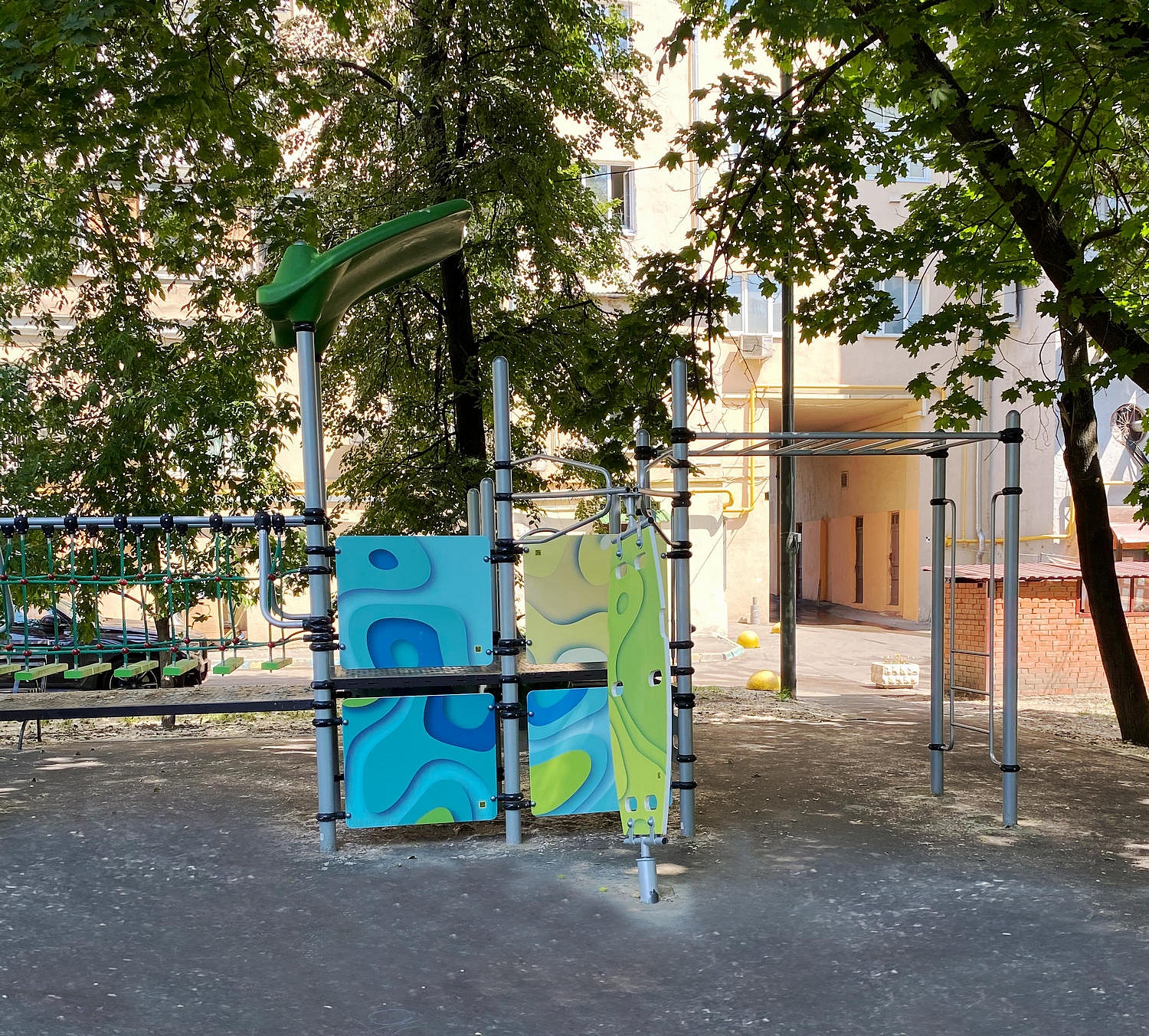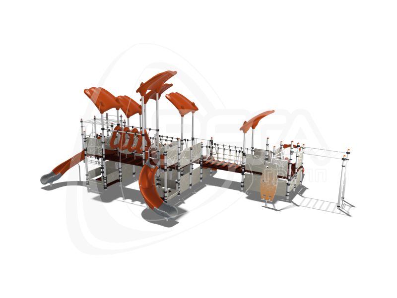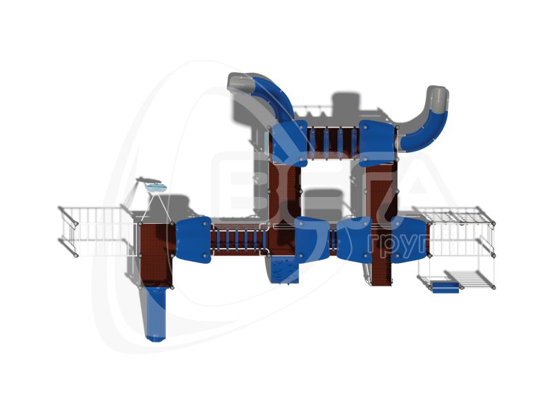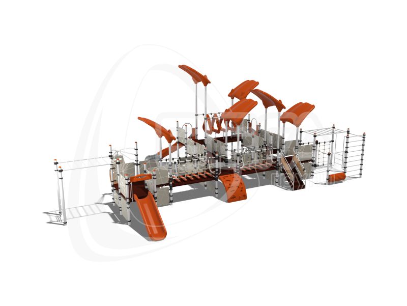 Детский городок состоит из открытых площадок и площадок, закрытых крышами “Козырёк ”. Городок оснащен элементом “Лопинг”, прямой лестницей для подъема, одним открытым прямым пластиковым спуском, двумя открытыми наборными гнутыми пластиковыми спусками, перемычками и перекладинами. Оборудован лавочками между стоек (2 шт.), беговым барабаном, лазом с отверстиями (2 шт.), лесенкой-рукоходом (2 шт.), двумя канатными мостиками, двумя вертикальными канатными лазами 1200 мм, лазом “Скалолаз” и лазом “Тоннель” на подвесах.