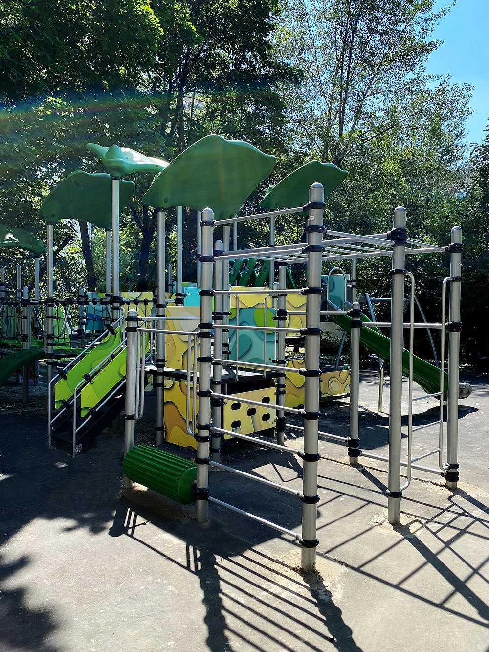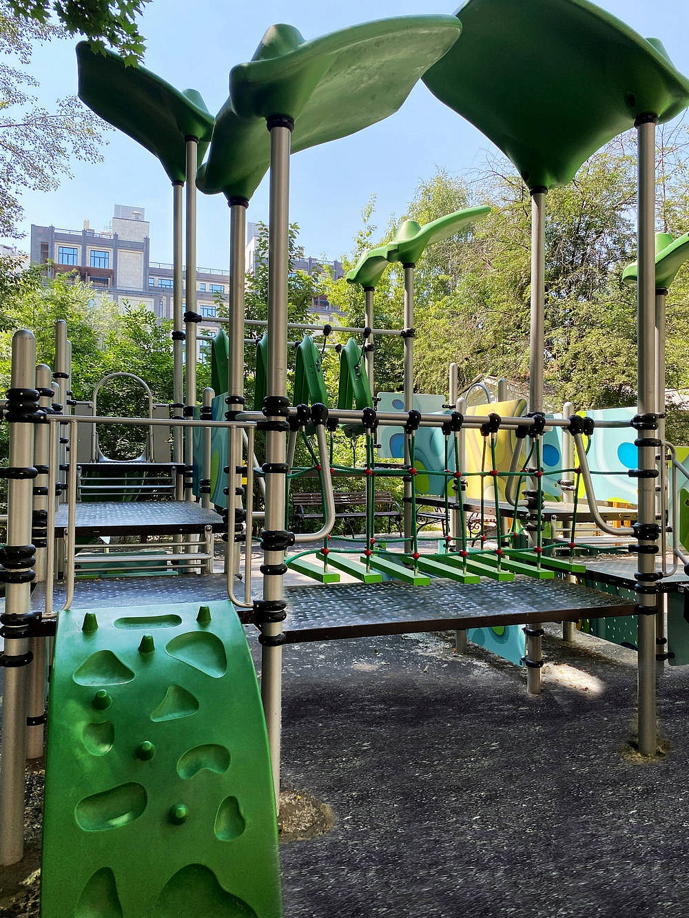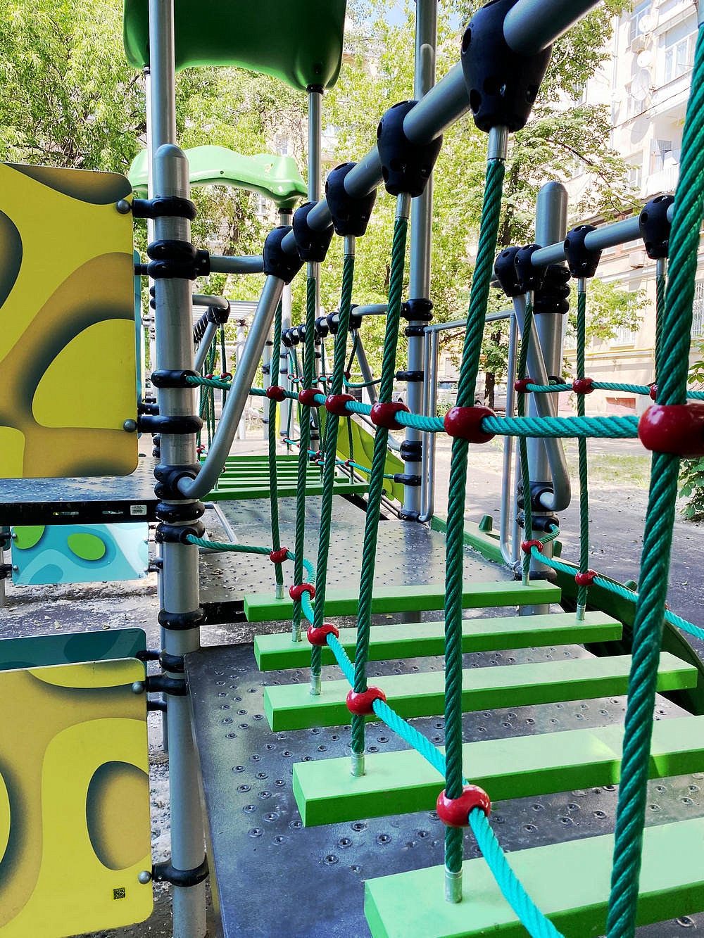 Детский городок состоит из открытых площадок и площадок, закрытых крышами “Козырёк ”. Городок оснащен элементом “Лопинг”, прямой лестницей для подъема, одним открытым прямым пластиковым спуском, двумя открытыми наборными гнутыми пластиковыми спусками, перемычками и перекладинами. Оборудован лавочками между стоек (2 шт.), беговым барабаном, лазом с отверстиями (2 шт.), лесенкой-рукоходом (2 шт.), двумя канатными мостиками, двумя вертикальными канатными лазами 1200 мм, лазом “Скалолаз” и лазом “Тоннель” на подвесах.