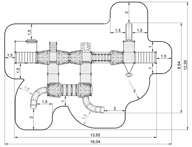 - Каркас городка выполнен из опорных стоек в количестве 38 шт. Опорная стойка представляет собой цельнометаллическую конструкцию из стальной трубы диаметром не менее 89 мм, с толщиной стенки не менее 2 мм, длиной 1900-5200 мм. Опорные стойки устанавливаются с помощью специальных закладных под трубу (из арматуры длиной не менее 200 мм, диаметром не менее 8 мм) методом бетонирования и с помощью металлических штырей с ушком для крепления (4 шт.).