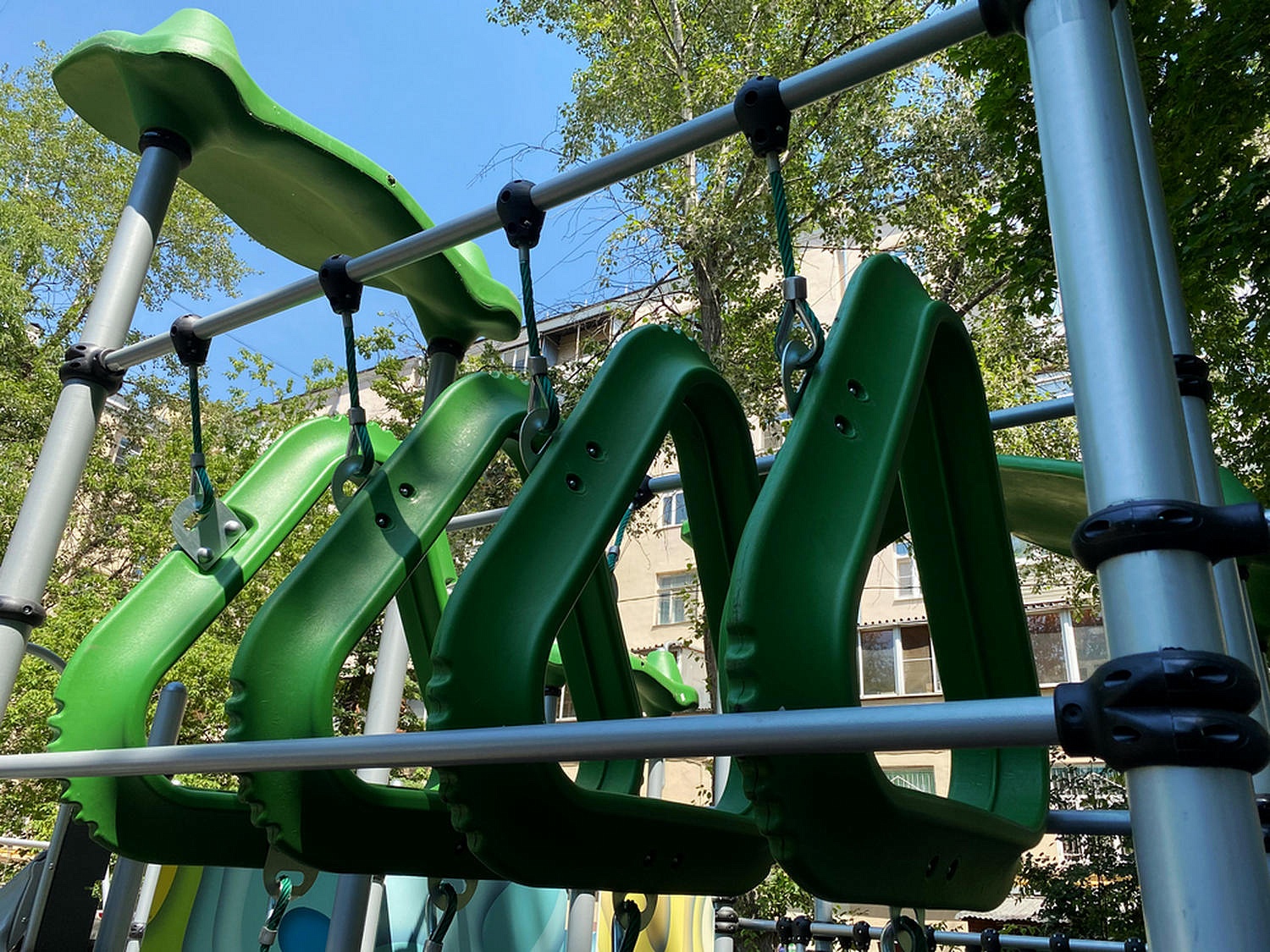 - Элементы к каркасу городка крепятся при помощи пластиковых хомутов из стеклонаполненного полиамида, фиксирующихся болтовыми соединениями, скрытыми в конструкции хомута. Использование стекловолоконного наполнителя увеличило прочностью, жесткость, стойкость к теплу и растрескиванию. Для надежной фиксации хомутов предусмотрены уплотнительные резиновые вставки, благодаря чему хомут плотно прилегает к трубе, не скользит в процессе эксплуатации.