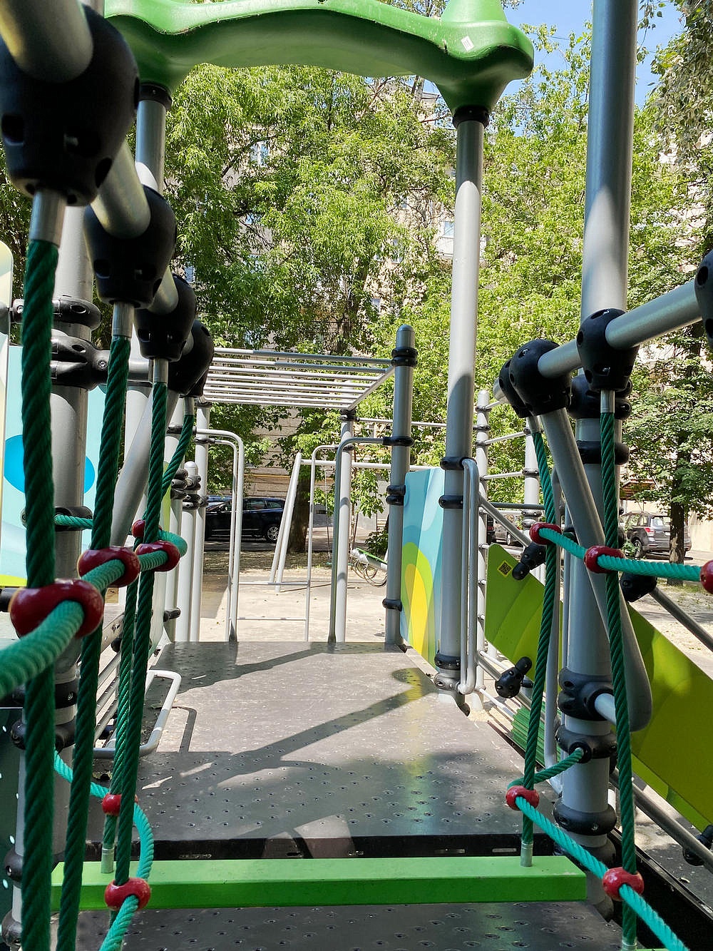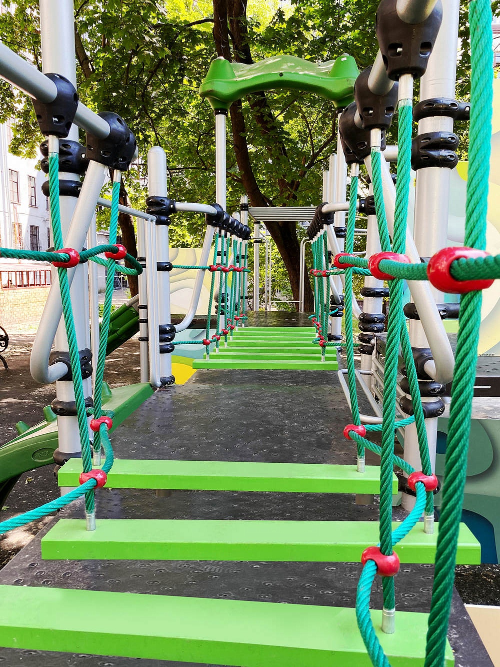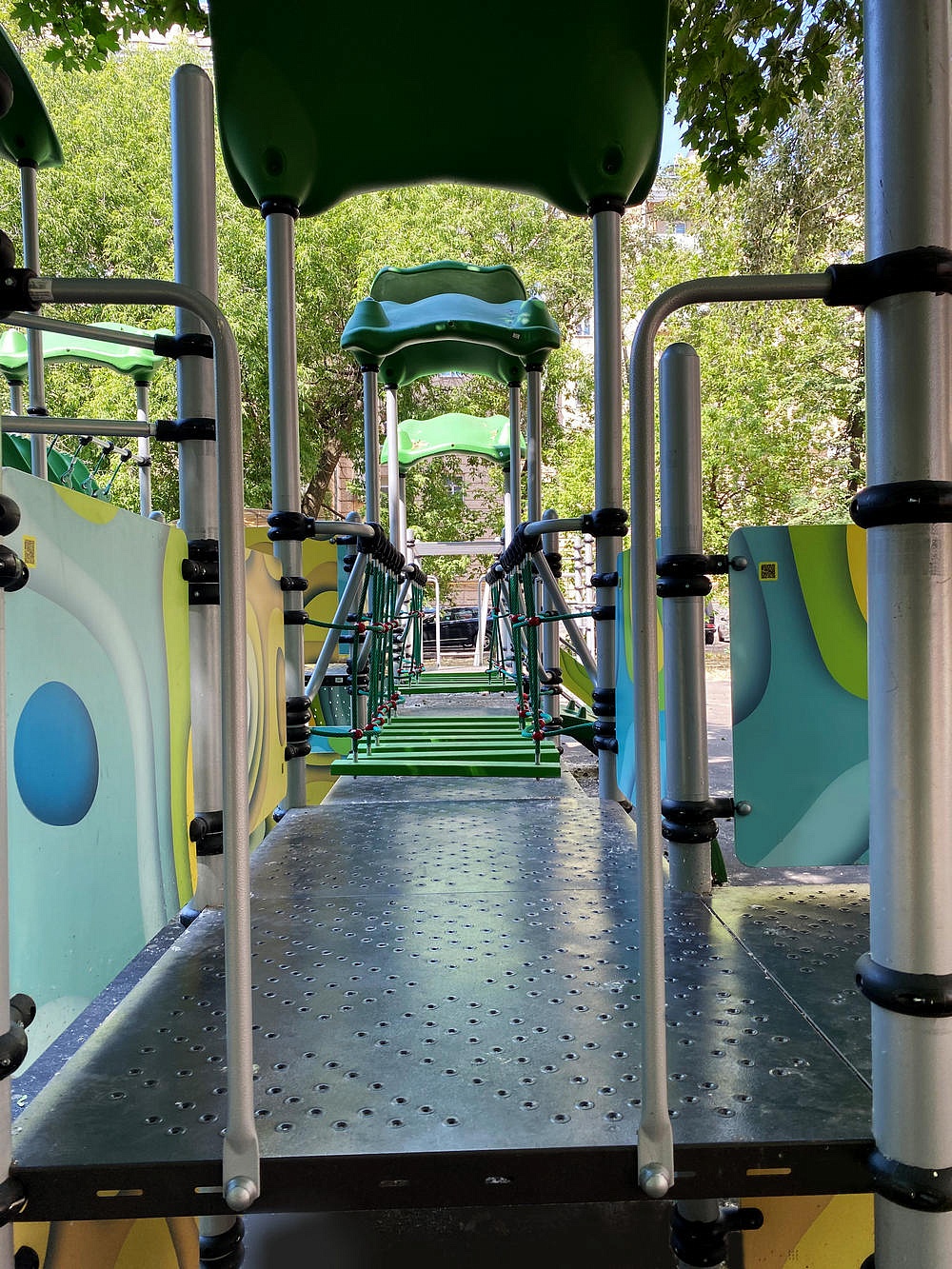 - Канатный подвесной мостик 2080 мм выполнен из канатных сеток 740*7х2200*2 мм (2 шт.), двух поручней канатного мостика (труба 42,3 мм) и ступенек 40х90х800 мм (7 шт.). Страховочная часть мостика выполнена из страховочной трубы канатного мостика диаметром 42,3 мм (4 шт.).