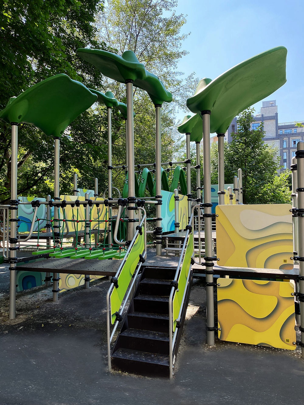 - Разноуровневые площадки основания (17 шт.) выполнены из стального листа толщиной не менее 1,5 мм с противоскользящей просечкой, изготовленной методом вырубки, с подшивкой на втором этаже из ламинированной фанеры толщиной не менее 12 мм. Площадки имеют дополнительные ребра жесткости из профильной трубы в виде специальной конструкции, проваренной Х-образно по периметру. Площадки разной высоты соединяются порожками 300 мм (4 шт.), выполненными из трубы диаметром не менее 26,8 мм с толщиной стенки не менее 2,8 мм.