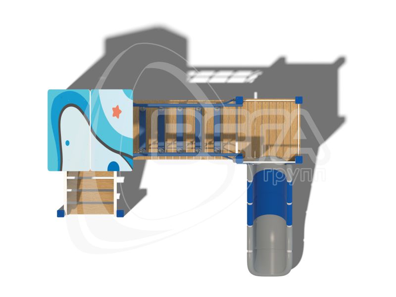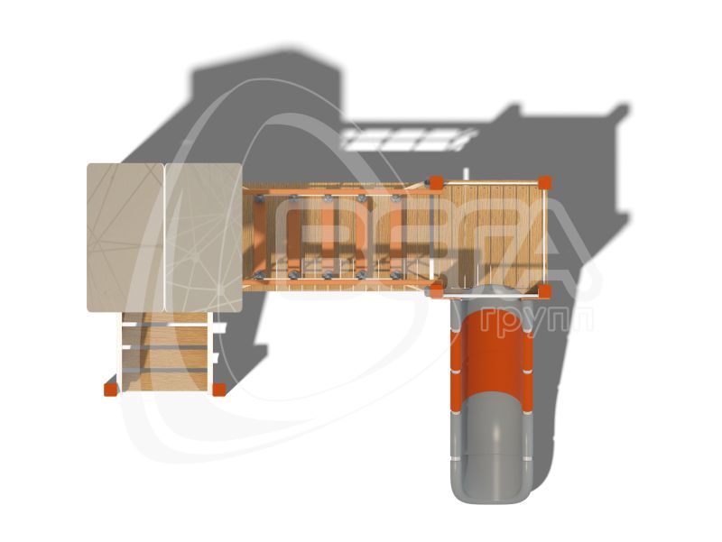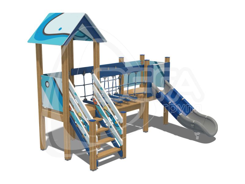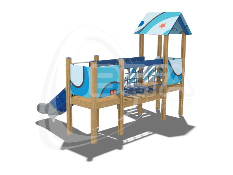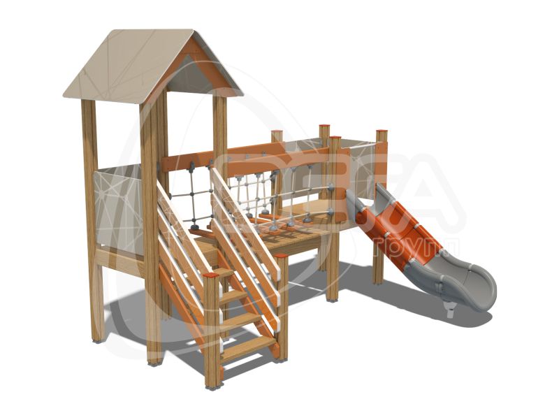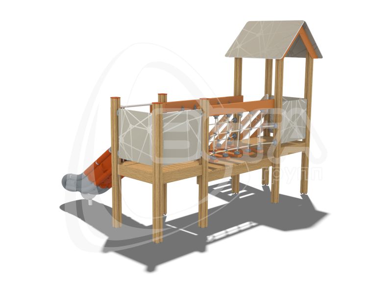 Детский городок оборудован площадками (одна с 2-скатной крышей), открытым прямым пластиковым спуском, деревянной лестницей 900 мм, канатным подвесным мостиком, перекладинами и перемычками. Выполнен с использованием деревянного каркаса (столбы) на металлических опорных закладных.