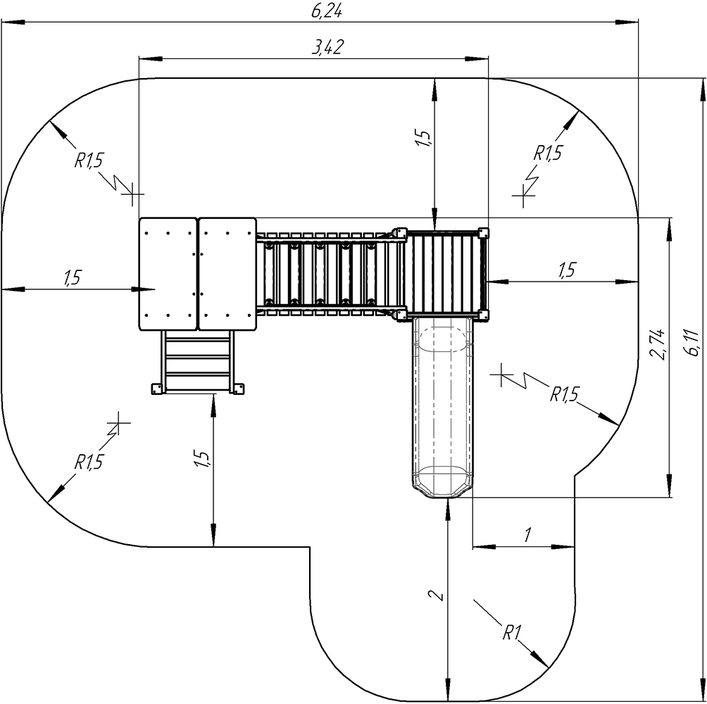 - Пластиковые элементы одинарного прямого открытого спуска изготовлены из линейного полиэтилена низкого давления методом ротоформования. У начала спуска установлена перекладина, за которую ребенок может держаться, когда садится на спуск для обеспечения безопасности. Спуск фиксируется на уровне земли с помощью закладной под трубу методом бетонирования.