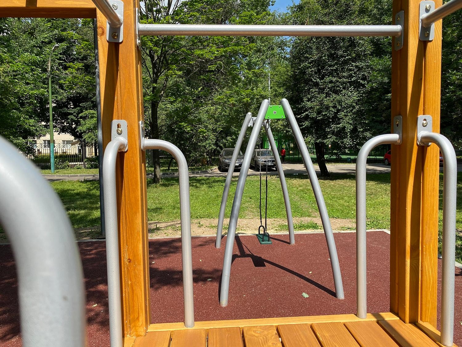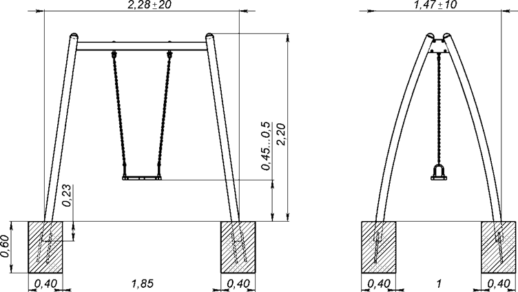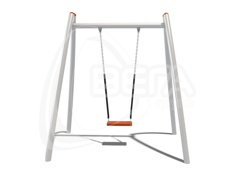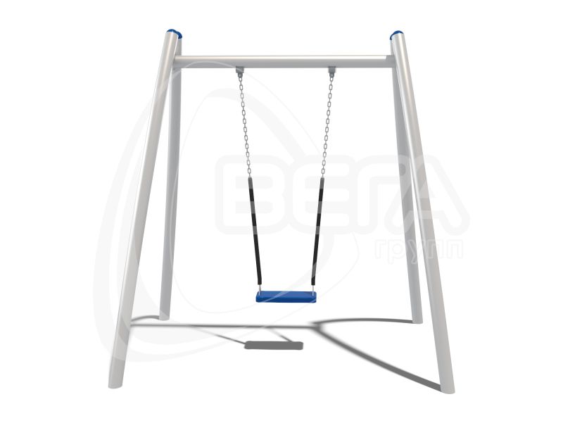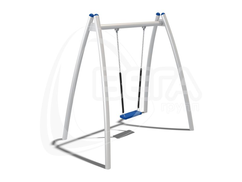 - Каркас качели выполнен из четырех изогнутых опорных стоек длиной 2500 мм и балки с подвесом для односекционных качелей. Гнутые опорные стойки представляют собой конструкцию из стальной трубы диаметром не менее 89 мм, с толщиной стенки не менее 2 мм. Стойки попарно соединяются в верхней точке, место соединения закрыто торцевой пластиной. Опорные стойки устанавливаются с помощью специальных закладных под трубу (из арматуры длиной не менее 200 мм, диаметром не менее 8 мм) методом бетонирования. Балка-перекладина качелей также изготовлена из металлической трубы диаметром не менее 89 мм с толщиной стенки не менее 3 мм. На перекладину с помощью электродуговой сварки закреплены металлические скобы с отверстиями для подвеса качелей.
