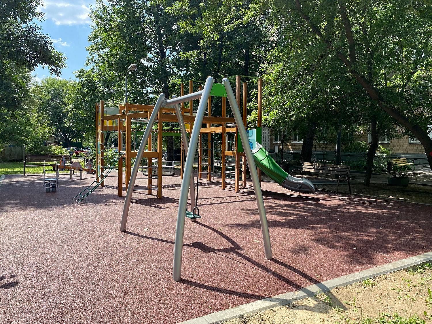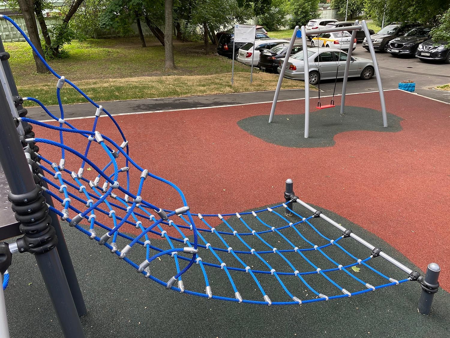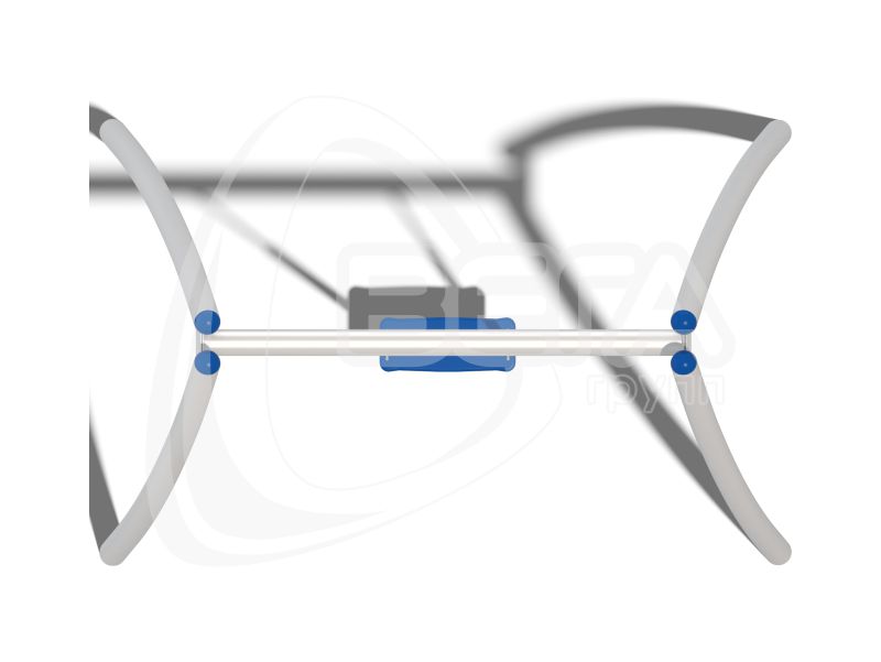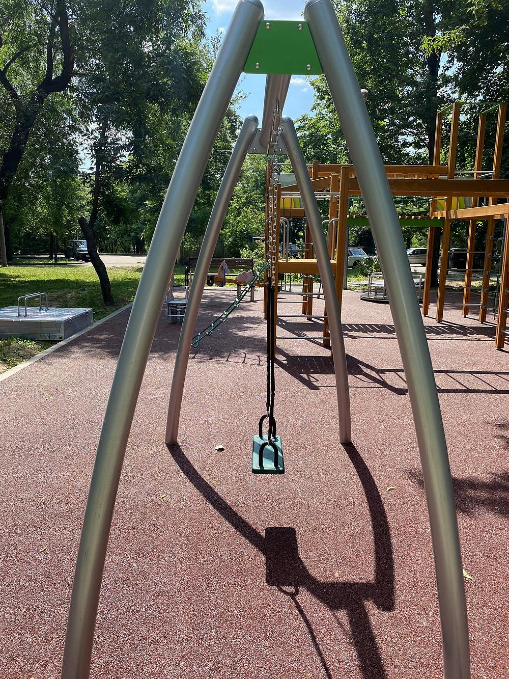 - Каркас качели выполнен из четырех изогнутых опорных стоек длиной 2500 мм и балки с подвесом для односекционных качелей. Гнутые опорные стойки представляют собой конструкцию из стальной трубы диаметром не менее 89 мм, с толщиной стенки не менее 2 мм. Стойки попарно соединяются в верхней точке, место соединения закрыто торцевой пластиной. Опорные стойки устанавливаются с помощью специальных закладных под трубу (из арматуры длиной не менее 200 мм, диаметром не менее 8 мм) методом бетонирования. Балка-перекладина качелей также изготовлена из металлической трубы диаметром не менее 89 мм с толщиной стенки не менее 3 мм. На перекладину с помощью электродуговой сварки закреплены металлические скобы с отверстиями для подвеса качелей.