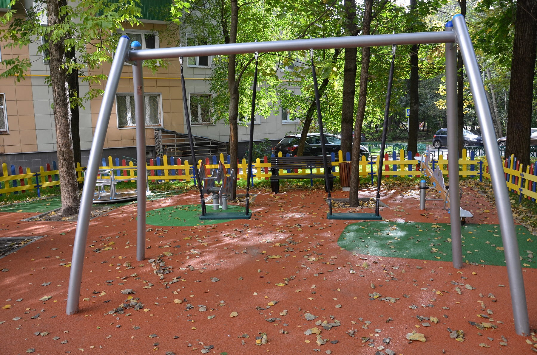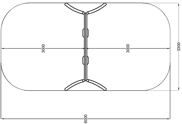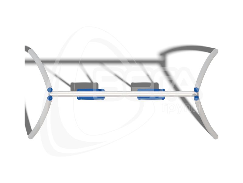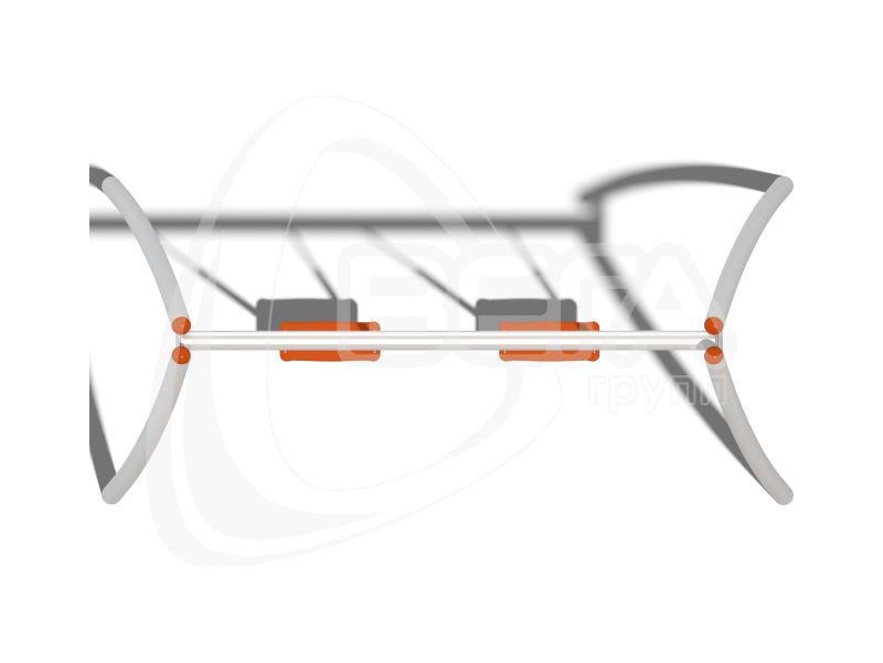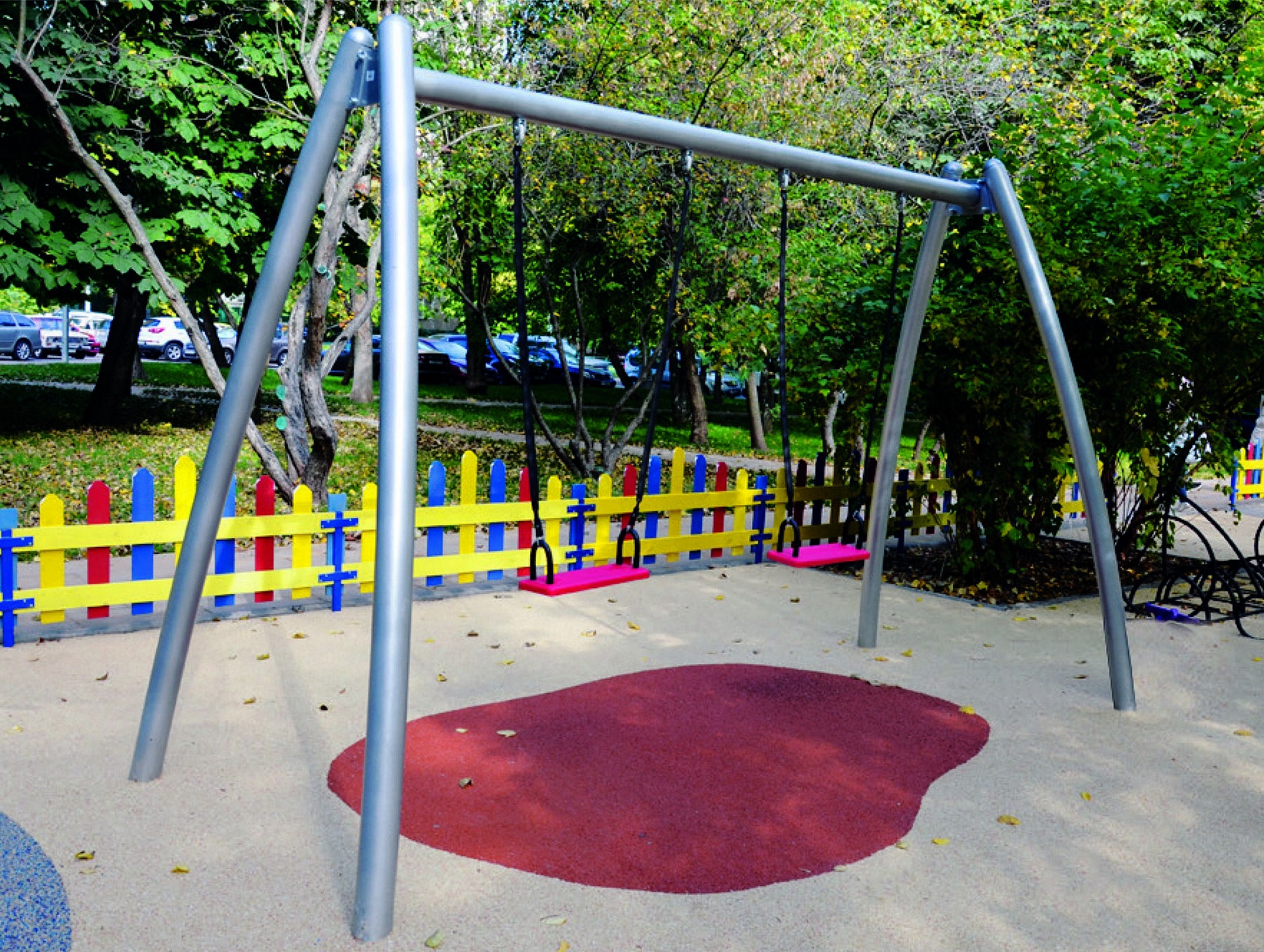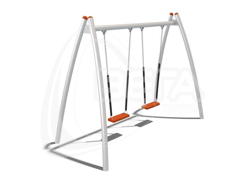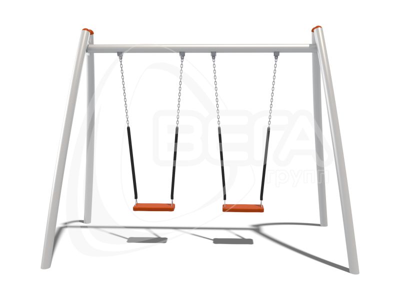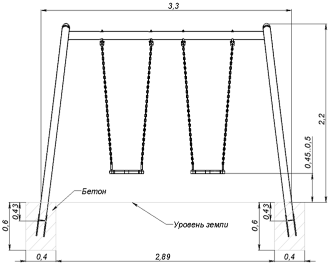 - Каркас качели выполнен из четырех изогнутых опорных стоек длиной 2700 мм и балки с подвесом для двухсекционных качелей. Гнутые опорные стойки представляют собой конструкцию из стальной трубы диаметром не менее 89 мм, с толщиной стенки не менее 2 мм. Стойки попарно соединяются в верхней точке, место соединения закрыто торцевой пластиной. Опорные стойки устанавливаются с помощью специальных закладных под трубу (из арматуры длиной не менее 200 мм, диаметром не менее 8 мм) методом бетонирования. Балка-перекладина качелей также изготовлена из металлической трубы диаметром не менее 89 мм с толщиной стенки не менее 3 мм. На перекладине с помощью электродуговой сварки закреплены металлические скобы с отверстиями для подвеса качелей.
