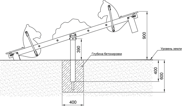 - Каркас качели выполнен из опорных стоек (2 шт.) и прямой балки-балансира для качели. Опорные стойки представляют собой цельнометаллическую конструкцию из стальной трубы диаметром не менее 89 мм, с толщиной стенки не менее 2 мм. Опорные стойки устанавливаются с помощью специальных закладных под трубу (из арматуры длиной не менее 200 мм, диаметром не менее 8 мм) методом бетонирования.