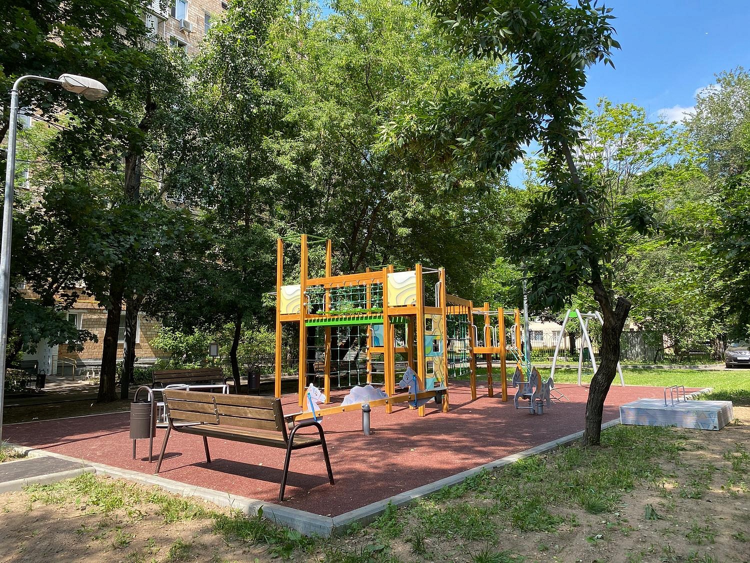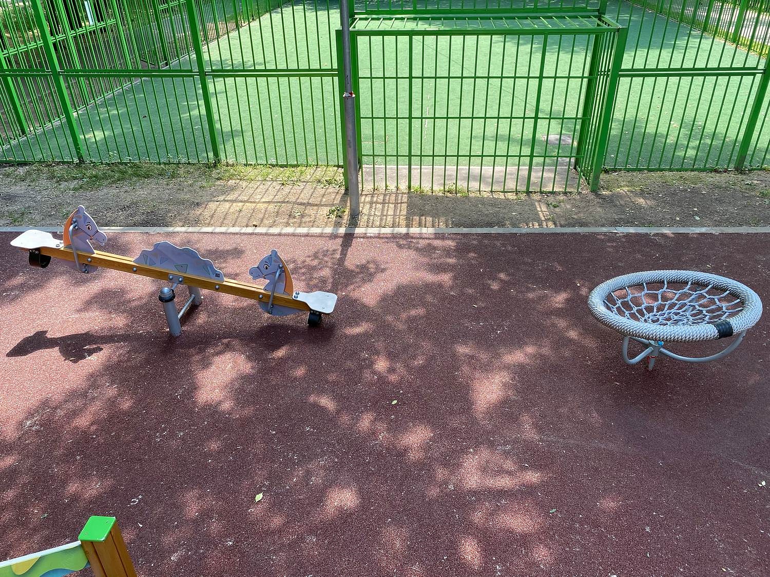 - Качалка оснащена с обеих сторон одинарными ручками-скоба (4 шт.). Ручка изготовлена из металлической трубы диаметром не менее 21,3 мм, толщиной не менее 3,2 мм.
