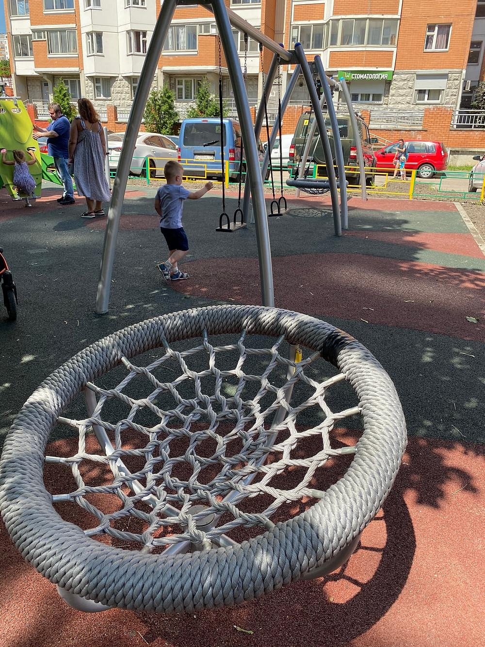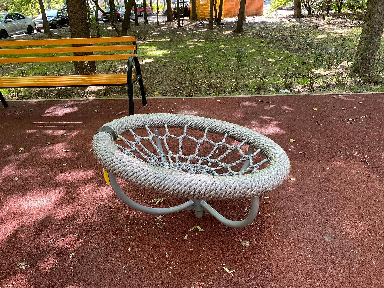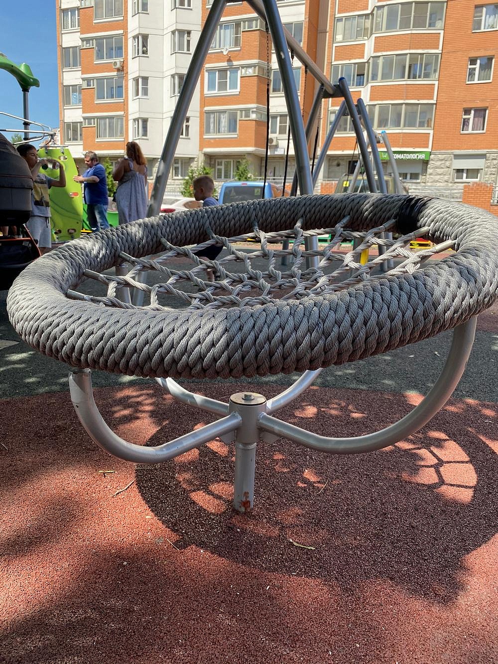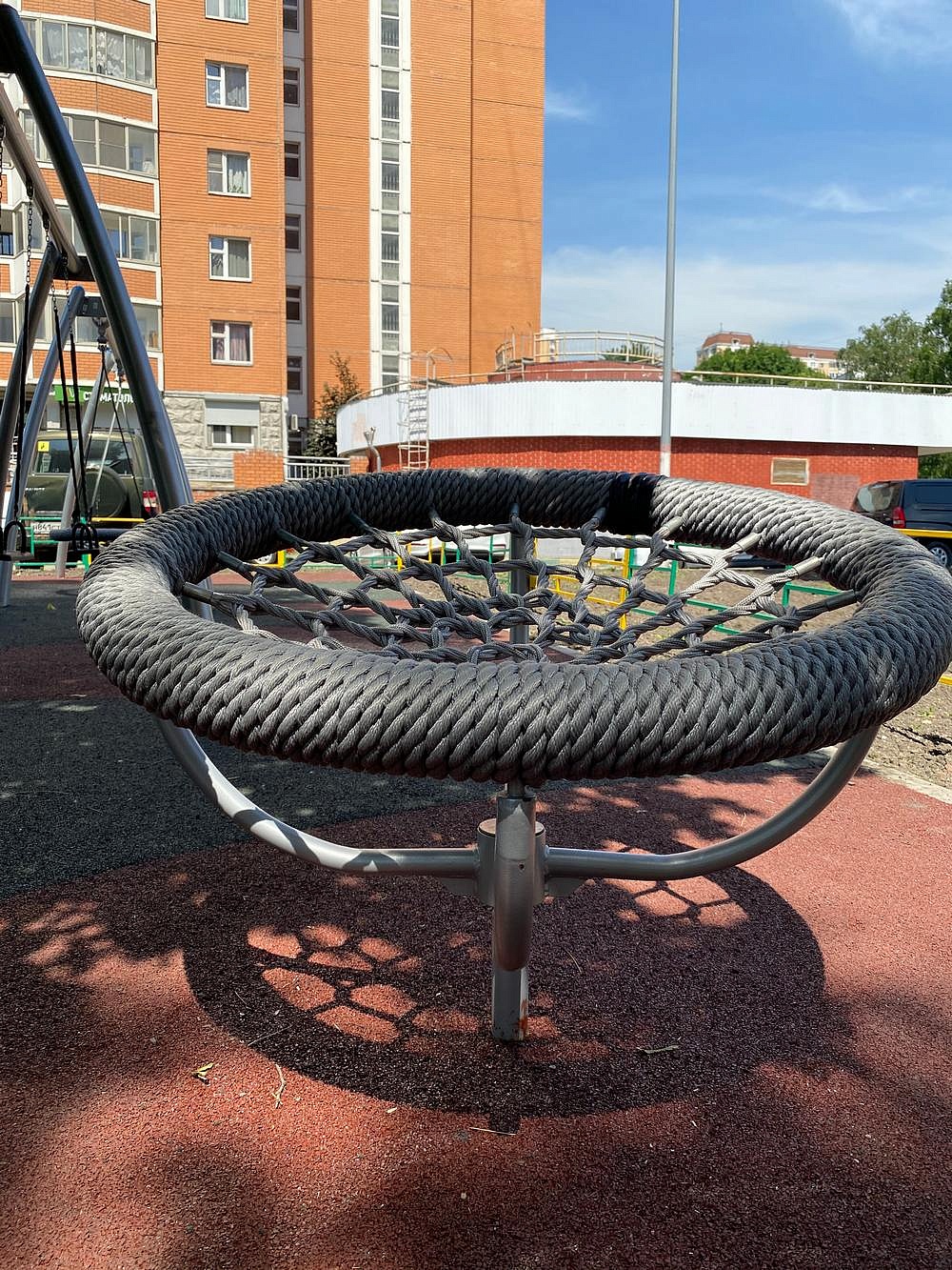 - Сиденье круглое “Гнездо” состоит из канатной сетки-паутины с металлическим ободом диаметром 1000 мм. Обод выполнен из трубы диаметром не менее 26,8 мм с толщиной стенки 2,8 мм. Сетка сиденья изготавливается из комбинированного четырехпрядного мягкого каната диаметром не менее 16 мм, который состоит из полипропиленовых нитей и стальных проволок для увеличения прочности и гибкости, что позволяет использовать его для конструкций сложных форм. Оплетка обода выполнена из мягкого 3-хпрядного полипропиленового каната, диаметром 19 мм. Внутри канаты усилены стальными оцинкованными тросами, толщиной не менее 1 мм. Материал каната устойчив к воздействию УФ-излучения, не выгорает, хорошо сопротивляется механическим воздействиям. Все соединительные элементы изготавливаются из алюминиевого сплава на автоматизированной линии.