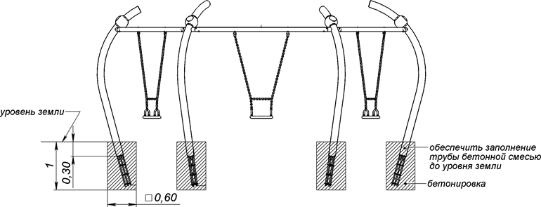 - Каркас качели выполнен из одинаковых изогнутых опорных стоек (6 шт.) и горизонтальных перекладин (6 шт.) между стойками. Стойки изготовлены из стальной трубы диаметром не менее 133 мм, с толщиной стенки не менее 6 мм. Конструкция устанавливается с помощью специальных закладных 750 мм (6 шт.) под трубу (из арматуры длиной не менее 200 мм, диаметром не менее 8 мм) методом бетонирования.