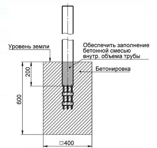 - Стойки 520 мм (3 шт.) выполнены из стальной трубы диаметром не менее 57 мм, с толщиной стенки не менее 3,5 мм. Конструкция устанавливаются с помощью специальных закладных под трубу в количестве 3 шт. (из арматуры длиной не менее 200 мм, диаметром не менее 8 мм) методом бетонирования.