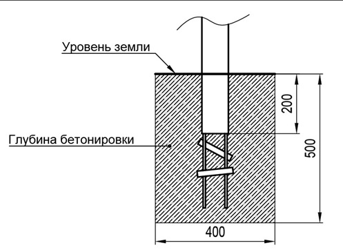 - Стойки (2 шт.) выполнены из стальной трубы диаметром не менее 89 мм, с толщиной стенки не менее 2 мм. Сверху стойки закрыты круглыми пластиковыми заглушками для труб. Конструкция устанавливаются с помощью специальных закладных под трубу в количестве 2 шт. (из арматуры длиной не менее 200 мм, диаметром не менее 8 мм) методом бетонирования.