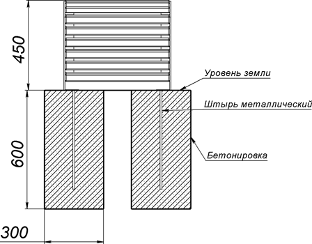 - Ножки устанавливаются с помощью металлических штырей под пятаки (4 шт.) методом бетонирования.