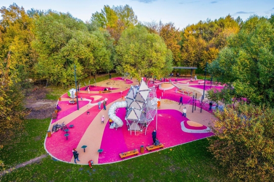 >>> игровая площадка в Терлецком лесопарке. Она похожа на лесное царство со сказочными домиками. Шесть башенок связаны между собой переходами, некоторые из них выполнены в виде деревьев-исполинов.
